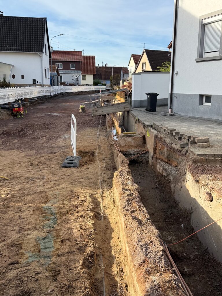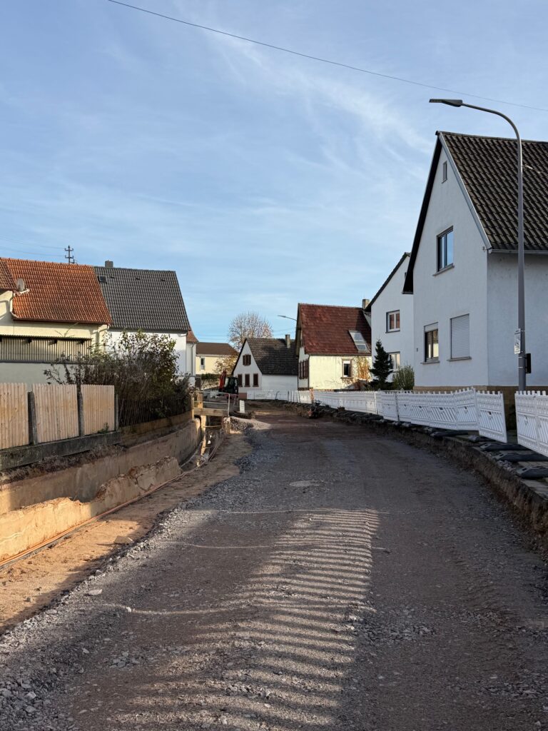 Bei gutem Wetter kommen die Ausbauarbeiten jetzt gut voran. Der alte Straßenbelag und die Gehwege werden zur Zeit zurückgebaut, sowie die Betonfassung der Bach. Auch die Kommunikation zwischen Anwohner und Baufirma funktioniert sehr gut. Mit Wurfzettel informiert diese über ihre Maßnahmen.